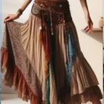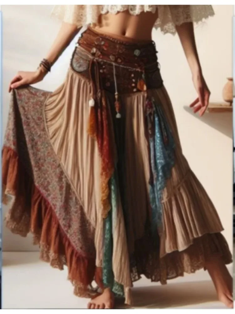 Retro High Waist Patchwork A-Line Pleated Long Skirt 2024 Summer Women’s Casual Skirt Elegant Street Ladies High Waist Skirt